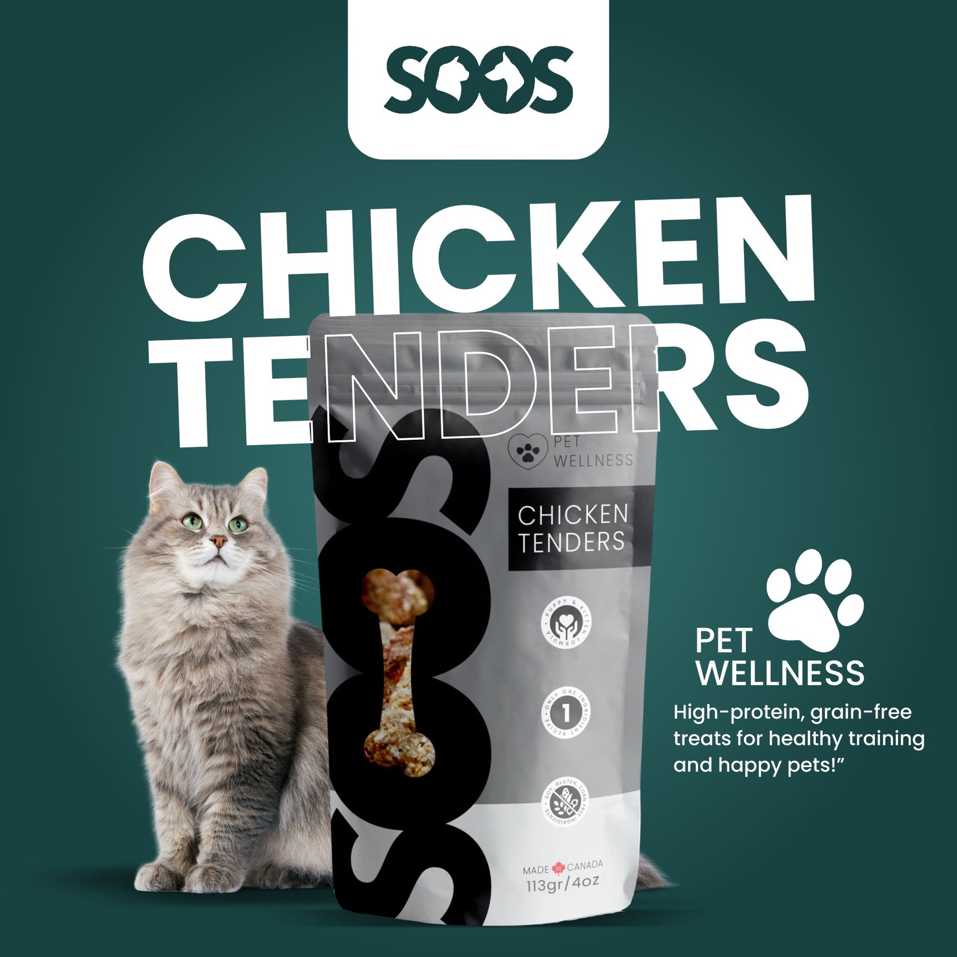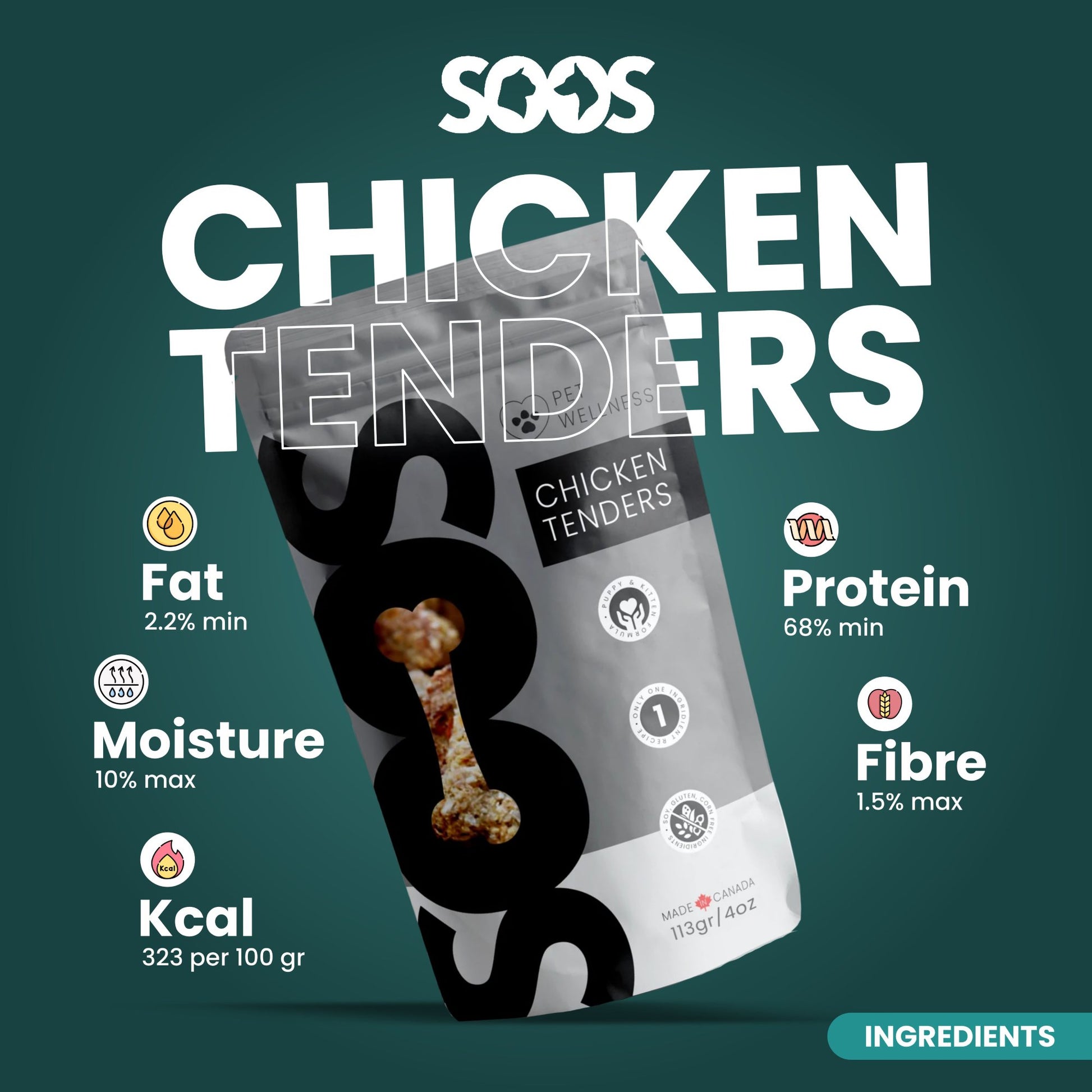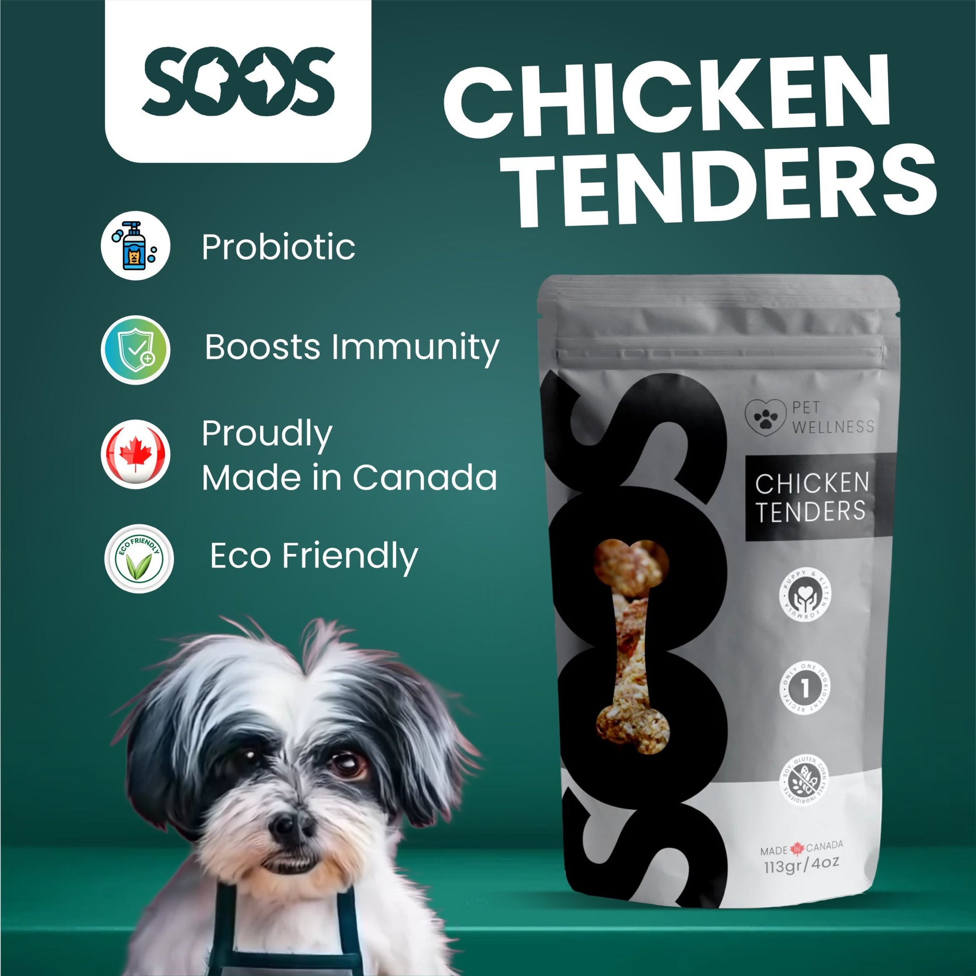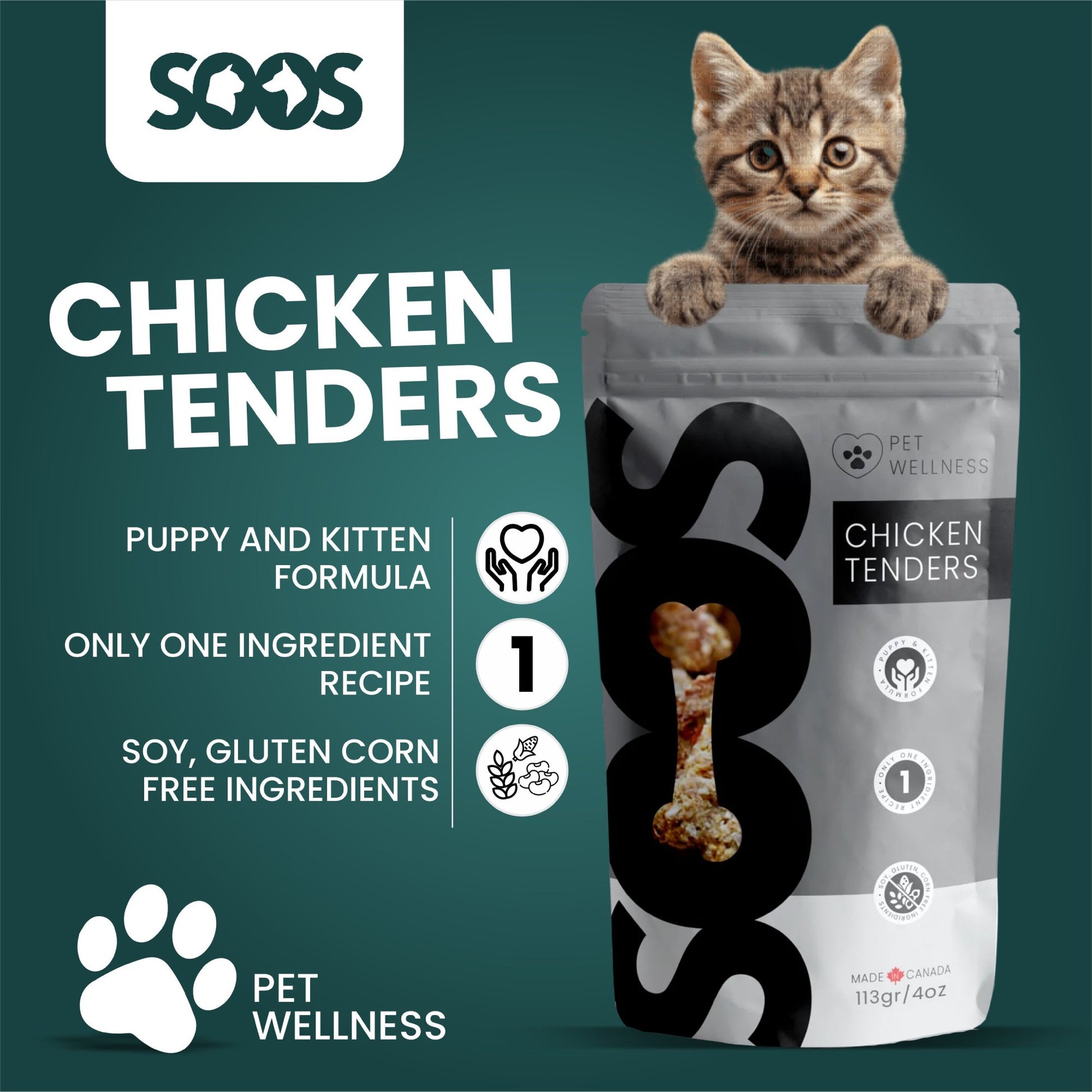 CHICKEN TENDERS One ingredient treat with a gentle digestive formula for young pets and pets with a limited diet. Made in a complex with Soos Pets Tearless Puppy & Kitten shampoo.